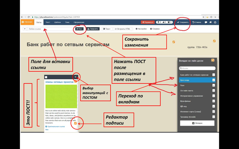 Когда Вы вышли в режим редактирования, Вам необходимо добавить на доску контент. Если это созданный он-лайн ресурс, то вам необходимо вверху страницы (слева) найти поле ПОСТ и вставить в него скопированную ссылку, потом нажать ПОСТ. Ваш ПОСТ разместится на выбранной странице. Каждый ПОСТ необходимо переименовать ФИО, нажав на маленький рыжий карандашик-редактор в ПОСТЕ. Обязательно после каждого действия необходимо сохранять страницу (в самом верхнем правом углу страницы). Под каждым постом есть поле комментариев, там будем писать отзывы о работах.